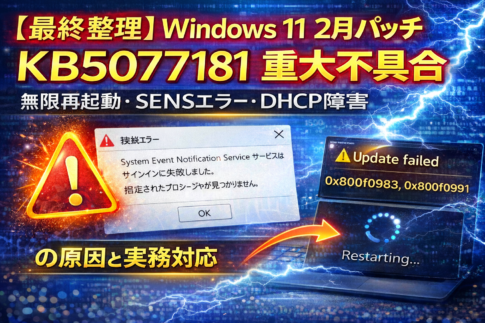 無限再起動・SENSエラー・DHCP障害の原因と実務対応 1️⃣ 何が起きているのか(確定している事実) 対象更新 主な症状 ❗① 無限再起動ループ(最深刻) ❗② SENSエラーでログイン不能 ❗③ DHCP異常(接続...
