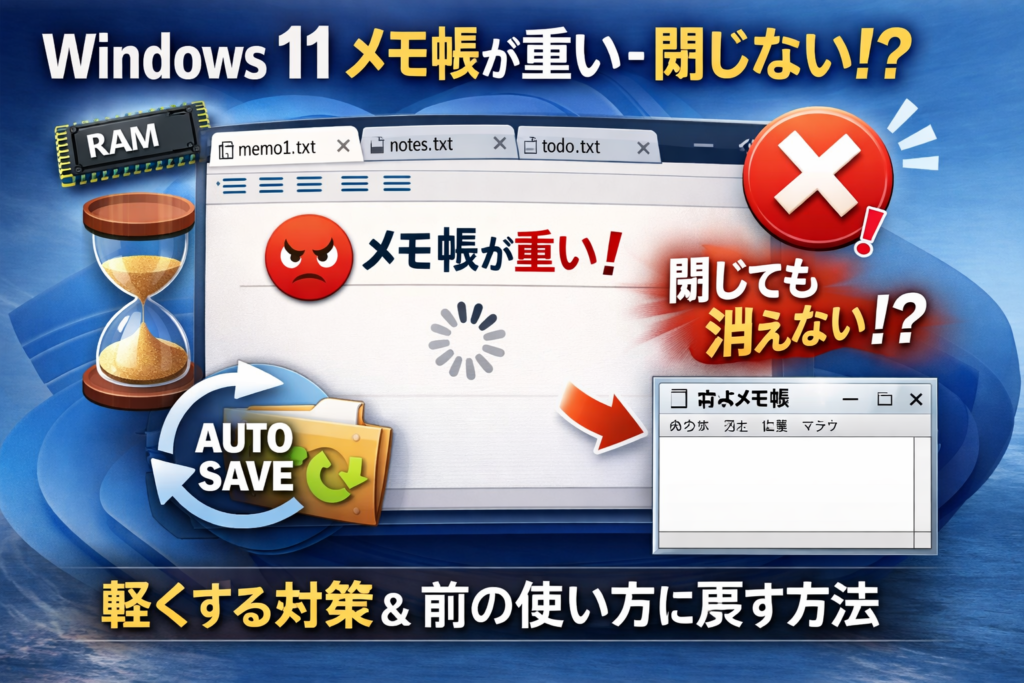 この記事では、Windows 11 のメモ帳が重く感じる理由と、サクサク使うための対策、さらに以前のメモ帳に近い使い方へ戻す方法をわかりやすく整理します。