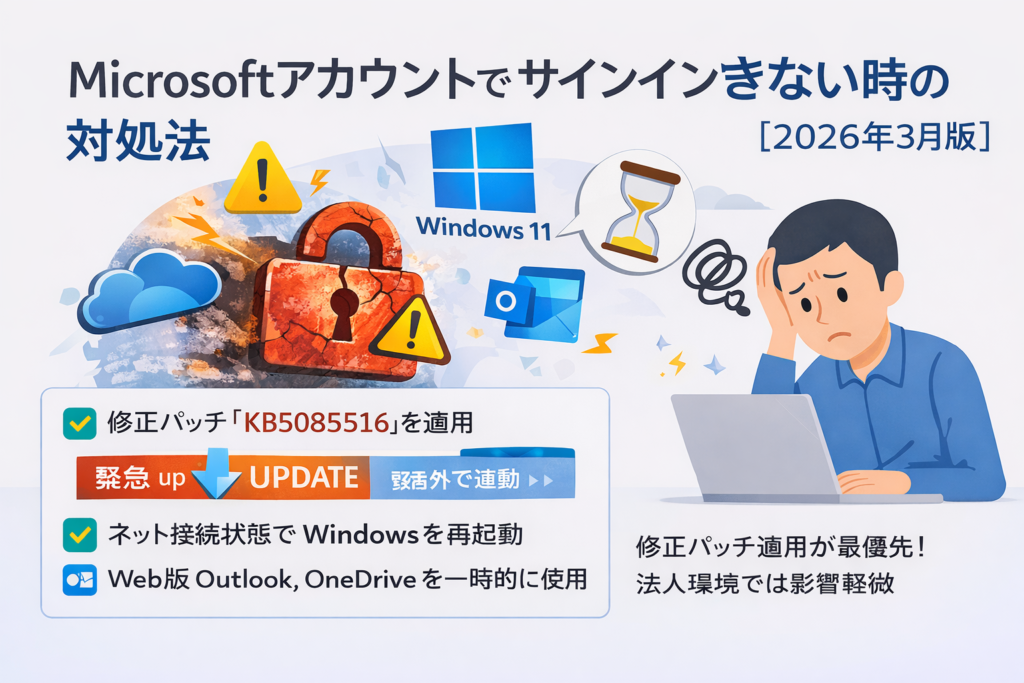 もし今まさに Word、Excel、Outlook、OneDrive、Teams などでサインインできず困っているなら、まず確認すべきは KB5085516 が入っているか です。