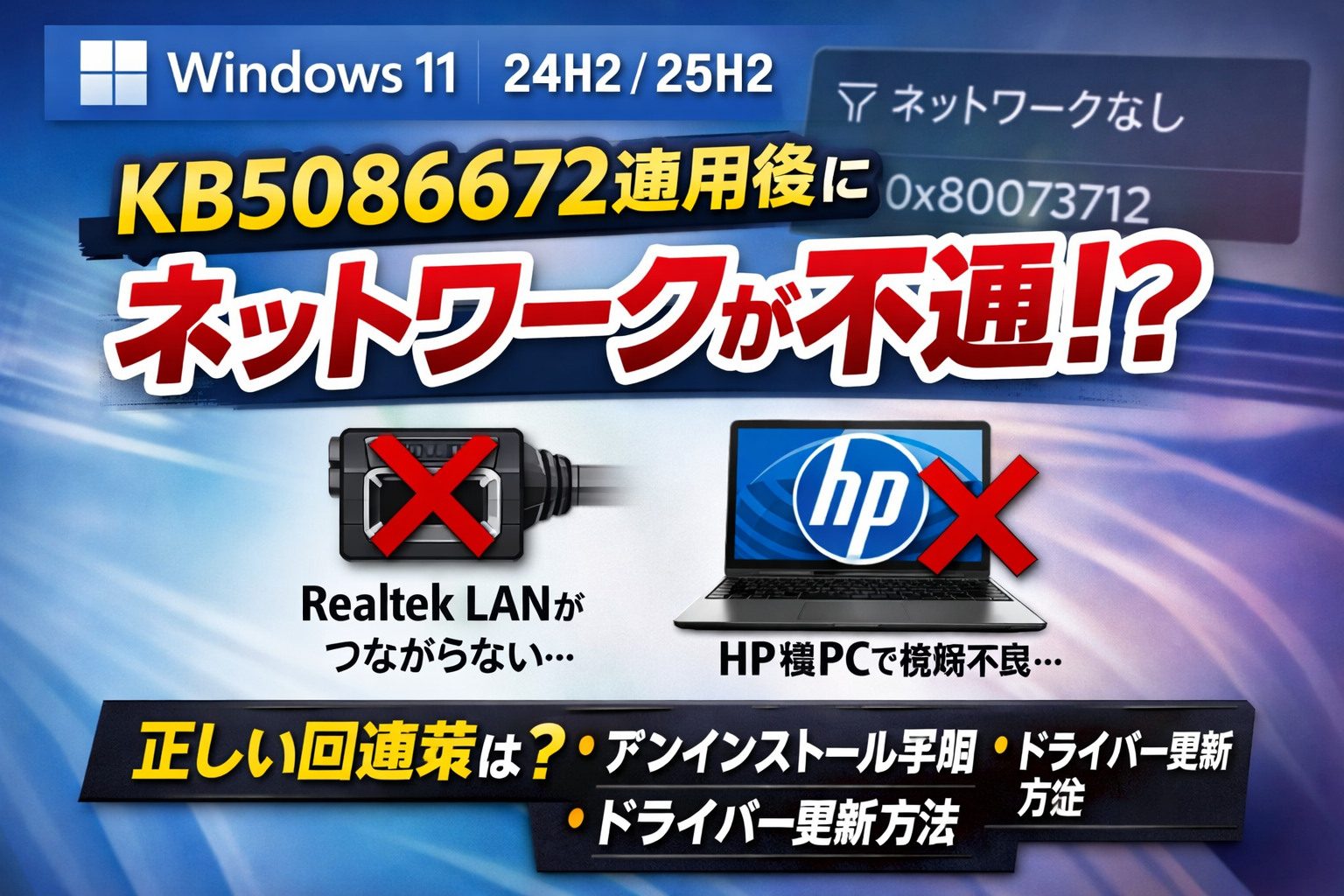 Windows 11 KB5086672 適用後にネットワークが使えない? Realtek LAN / HP製PCの原因・切り分け・回避手順まとめ
