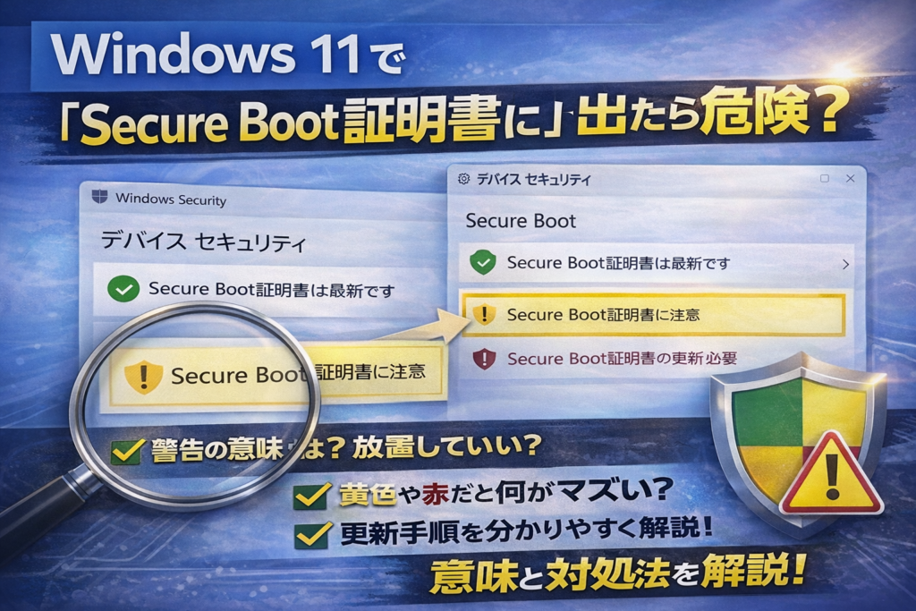 Windows 11 の警告表示は、急に出るとそれだけで焦ります。 特に「Secure Boot」という言葉は普段あまり触れないため、 「ウイルス?」「起動不能?」「今すぐ何かしないと危ない?」と感じやすいテーマです。