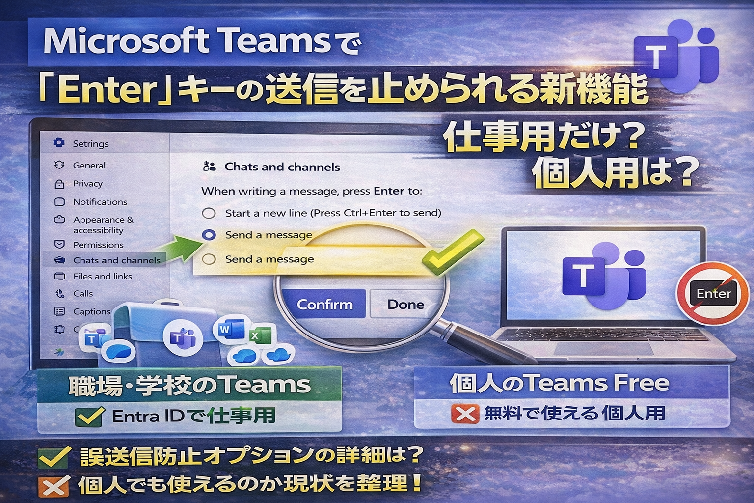 Teams の[Enter]キー動作変更は、現時点では仕事用Teams側で確認できる新機能です。 個人用Teams Freeでは同等設定は確認できないため、従来どおりショートカット操作を利用してください。
