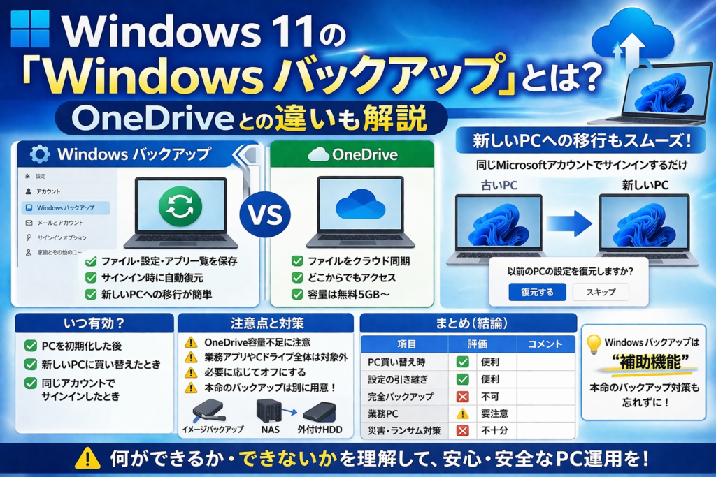 この記事では、Windows バックアップとは何か、OneDriveとの違い、何が保存されるのか、移行時のポイント までまとめて、実務目線でわかりやすく整理します。