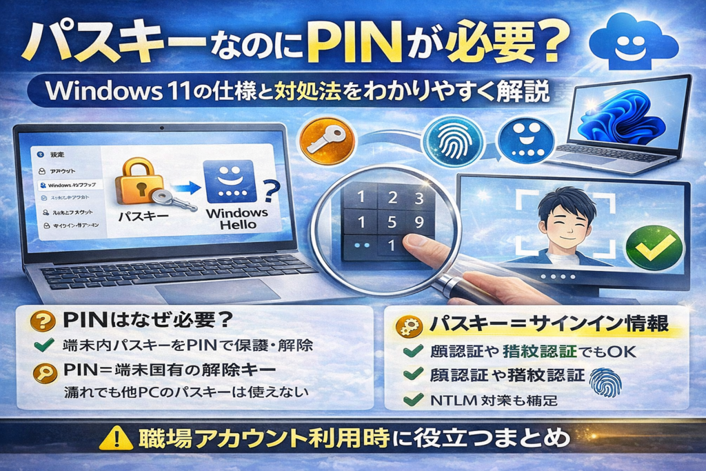 パスキーは、パスワードの代わりに使える新しいサインイン方法として広がっています。 ただ、Windows 11 ではパスキーを使おうとすると、Windows Hello PIN の設定を先に求められることがあります。