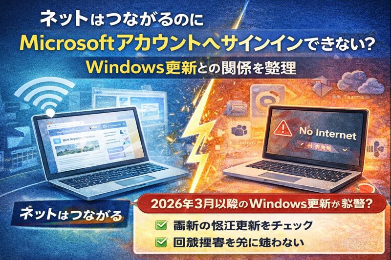 通信できているのにMicrosoftアカウントだけログインできないなら、ネット障害よりWindows更新の影響を先に疑うべきです。特に2026年3月以降の更新後に起きたなら要注意で、最新の修正更新を適用するのが基本対応です。