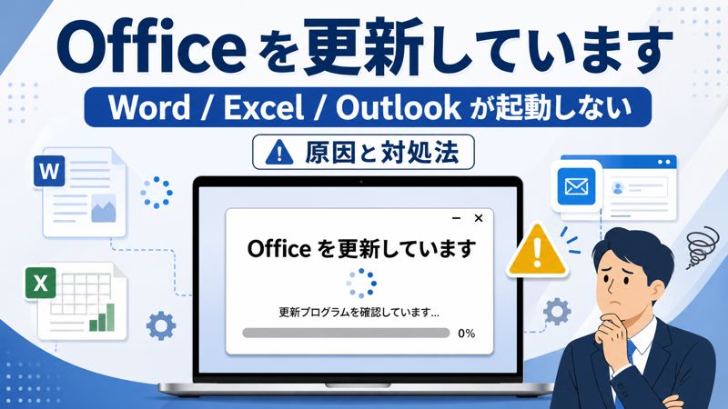 先に結論から言うと、 「Officeを更新しています」でWord・Excel・Outlookが起動しない場合は、Officeの更新処理が正常に完了していない可能性が高い です。