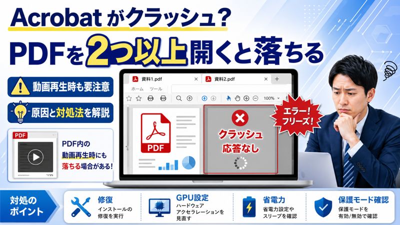 PDFを2つ以上開いた時や、PDF内の動画を再生した時にAcrobatがクラッシュする場合、 PDFファイルだけが原因とは限りません。 Acrobat本体、GPU描画、グラフィックドライバー、保護モード、プラグイン、保存場所など、 複数の要因が関係している可能性があります。
